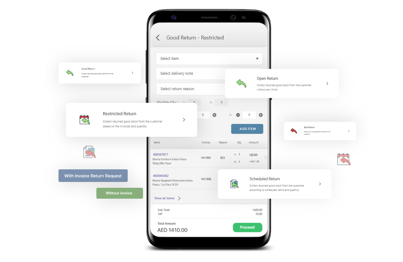 Configure Return Policy (SKU/Category/Qty) level. Returns are tagged to Invoices to ensure Quantity, Price & Free Good policy is adhered. End-to-End Reverse Logistics till warehouse. Initiate Open, Restricted, Return Request & Execution